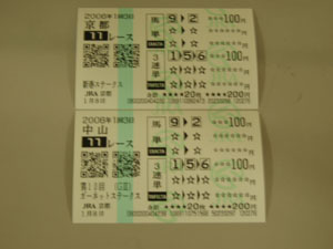 さて、最終レース。ここまでズタボロな成績で、かなり凹んでたハチ。このまま、失意で大阪に戻る……事を覚悟していたハチが、苦しまぎれに買ったワイド5点の内、2−9が250円、3−9が440円、2−9が810円と、見事に3点的中。更に(下の写真には入ってないが)直感で買った、馬単9−2の1点買いが的中して950円。
