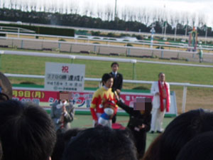 | 武騎手にとって2700勝のメモリアルなんだが… (ちなみに奥のスーツの男性は厩務員さん) |