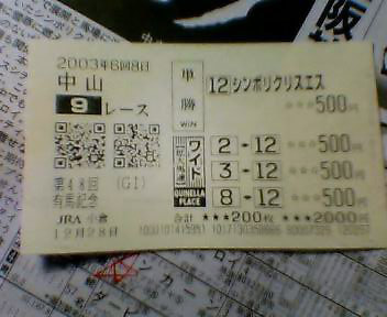 そんなこんなで、有馬記念スタート。途中まで中段の位置で競馬をしていたクリスエス。が、3角からスイスイと伸びて来て、結局は9馬身のレコード勝ちで圧勝!2着3着にはリンカーン、ゼンノロブロイが来て、単勝だけでなくワイド2点も的中。これで、バス代が浮いた♪