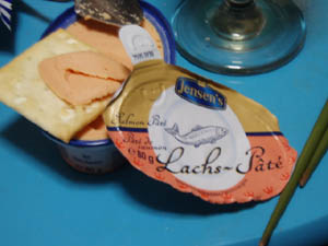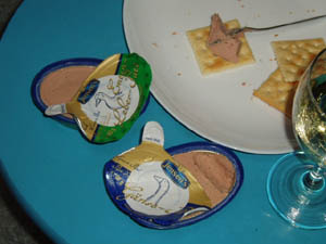 缶って言うか、ペットフードでよくあるような感じの、薄いアルミ容器開ける。ムッ…と、肉の臭みが鼻をつく。ちょっと日本人には馴染みの無い匂い。が、クラッカーに乗せてかじると、臭みが意外と気にならないから、不思議。