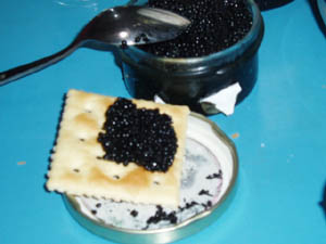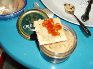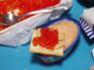 まずはビールで、昨日の残りのパテ類とクラッカーを消化する。サーモンパテの上に、前に買ってきたイクラを乗せて食らうと、これが良い感じ。