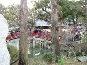 去年の疲れを未だ引きずっていたハチは、アレ見ただけでうんざり。横道にバイパスして、本殿へと向かった。冬コミのエロスペースを切り取ってきたような太鼓橋の修羅場を、ちと撮ってやろうかと、カメラを構えた。が、警備員がワラワラと出てきたんで断念。大人しく本殿に入ったハチだった。