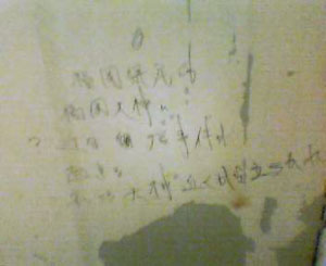 | 今年の元旦撮影。大宰府天満宮にて、 絵馬を書く机の、見えない場所に書いてあった落書き。 その内、ヨースルの人が翻訳してくれるだろう |