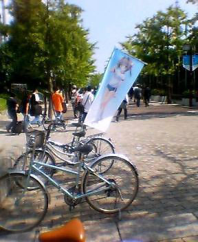 携帯カメラなので分かり難いが、彼等は、聖地・初音島で聖別されたというD.CUを描いた大軍旗を、南港の潮風になびかせ、インテックスに駐留していた。本来ならば彼等は、サーカス商法を護る楯として、サーベルを片手に秋葉原あたりを疾走している筈なのだが、何の理由で大阪に居たのかは不明。