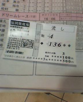 さて、福岡競艇に到着。時は、メインの12R〆切間近。番組表を眺めると、1号艇藤丸が固いように思われる。が、前の賞金王でやったような、4番買いへの誘惑がハチを襲う。まぁ遊び半分って事で、4号艇からの拡連複流しで買ってみた。