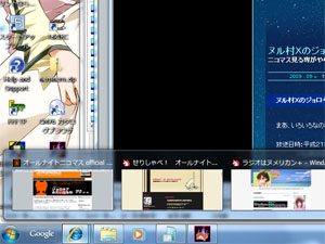 おぉ、こういうコトか。IEにカーソルを合わせると、今出てるウィンドウのイメージが出るような細工になってるらしい。これは便利かも。従来のようにツールバーが混雑しないし。