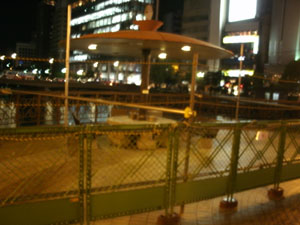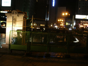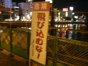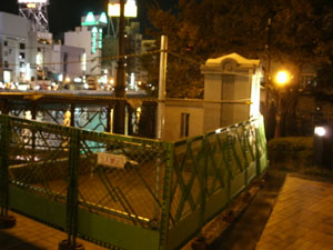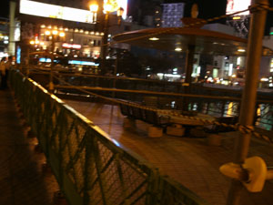 異様な沈黙に包まれた、であい橋。いやー、すっかり様変わりしていて驚いたよ。橋には、ベンチやら欄干(らんかん)やら、およそ飛び降りる足がかりになりそうな箇所はバリケードが作られていて、どこの軍事境界線だよ?!って感じで、恐ろしく物々しい様相に大変身。もちろん橋には、警官がガッチリとガード。警察のダイブ断固阻止!に対する恐ろしいまでの執念を感じられた。