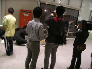 しばらく待ってると、号外が到着。人々が号外の束へと一斉に群がっていった。配り方も様々で、普通に立って配る人もあれば、座り込んで、束の山を床にバラしつつホイホイと渡していく人もあり。んで、それらの光景をTVカメラが撮っていた。
