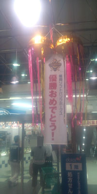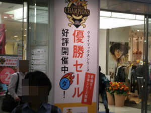 実際問題、号外が出回るまでは数時間はタイムラグがあるだろうから、それまで、優勝直後の天神の町を見て回ることに――と言っても、何せ直後の事だし、CSも勝ってないしで、反応は意外と普通。とはいえ、天神パルコでは気が早く、早くも即日のうちに優勝セールを始めていた。
