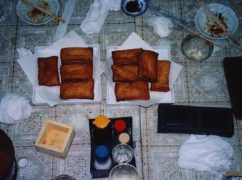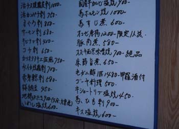 日本酒が出てきた。枡の中に溢れんばかりに満たされたコップ、っていう居酒屋の典型的な形。ハチはこのパターンが好きだね。無造作にコップを出されるよりは一億倍良い。出されたお酒は…(思い出してる)辛さも程ほどのシャープな飲み味だったね。そういえば、今日はアヤックスさんが誕生日とか。で、我らが司令が焼酎を一本プレゼントしてくれるという。出てきたのは、小樽で冷やされた一本の小瓶の焼酎。その名もズバリ「味のれん」(750ml)1800円で、ボトルキープ・持ち帰り可だそうだ。先のGPMミレニアムで景品に出されたと言う焼酎は多分これだろう。皆で飲むことになったので、手持ちの酒を瞬間的に飲み干し、味のれんを頂いた。酒を薦められたら、飲みかけを速やかに飲み干し、酒を頂く。これが酒乱舞踏の礼儀!!