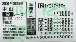 直線まででは3着以内は確定!と思ってたら、マンハッタンカフェが大外から豪快に古馬を斬り捨てて、まさかの優勝。オペラオーは5着。あああ……んでもって、2着には最低人気のアメリカンボスが滑り込み、馬連48650円の超万馬券。しまった!こっちの方だったか!!
