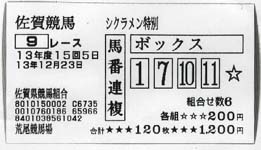 十中八苦、Kが嬉々として電話をかけてくるだろうから、呆然としつつも、携帯の電源を切っておいた。が、世の中はわからない。その後の佐賀のメインレース(相互場外やってるの)で、馬連複8410円をズガン!と当ててしまう。200円買ってたから、16820円の払い戻し。いやぁ…マグレ当たりってあるもんだね☆収支プラスどころか、今日の交通費まで稼いでしまう(汗)当然の事ながら、荒尾には馬券コピーなどという気の効いたサービスは無いので、近くのセブンまで走ってコピーしに行った。
