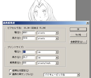 と、その前に、このファイルはカラーを前提に400dpiで取り込んじゃってるので、解像度を変えよう。「イメージ」→「サイズ変更」→「画面解像度」で、600dpiへ変更。「画像の再サンプル」にはチェックを入れててOK。多分。その後、「幅」「高さ」を、用紙サイズに調整する。