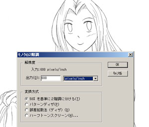 ま、それ自体は、Photoshopでカラー原稿作ってたときには、「選択範囲の拡張」で解消できたんだが、主線が曖昧になってて、はみ出したり残ったりしてしまう。それの処理が大変だった。表紙ならともかく、何ページもある本文で、それをするのは大変。なんで、空白は完全な白!主線は完全な黒!にしてしまったほうが、作業がしやすい。それに、本文の解像度は600dpi。これだけあれば、モノクロ2階調(2値)でも、線がカクカクする心配は無いらしい。