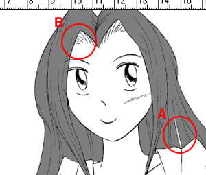 その後、どうしても発生するであろう、選択漏れ(A)や、自動選択では選べない生え際(B)を、【ペンツール】で塗ってしまう。後は、黒く塗った部分を選択、別レイヤーにて、トーンを貼れば完成。