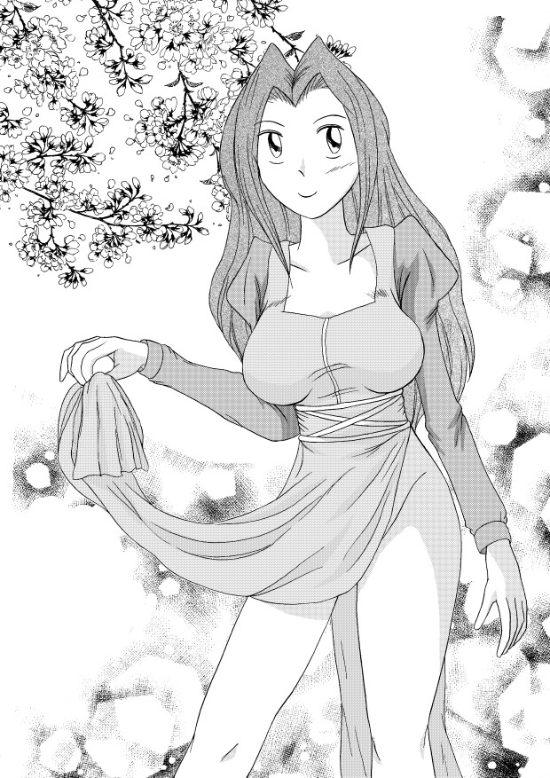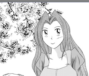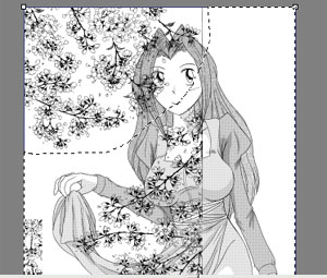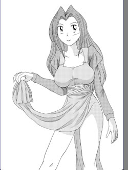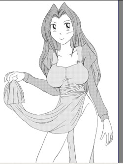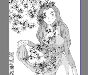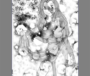 上の要領で、ついでに肌のトーンも貼ってしまい、これにてキャラのトーン貼りは完成。予め別レイヤーで、選択範囲を作る作業に、多少の戸惑いは感じたが、モワレの心配をしないで良い分、気楽に作業を進められる。