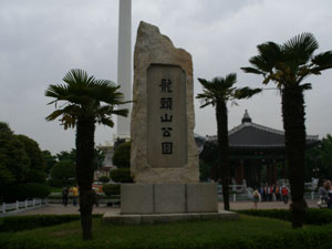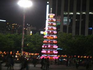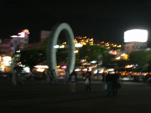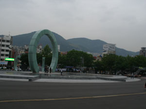 | 釜山駅前の広場 | 同じく駅前広場より。この灯篭(?)は花祭関連のモノらしい |