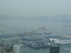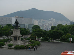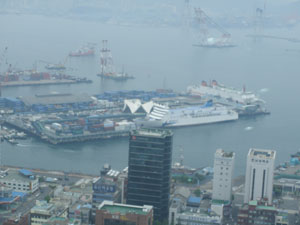 | 釜山タワーのある建物の展望台から。 タワーに登らずとも、なかなかの景色。左端は李舜臣像 |