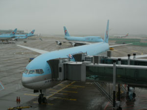 既に搭乗口で待っていた、この便の同行者であるKの罵詈雑言を浴びながら、機内へ。――話は長引いちゃうけど、ちょっと解説しとくか。今回の旅のメンバーは…って言うか、日韓アニメ研究会の取材旅行にハチが同行する形なんだが。で、参加メンバーは、同研究会の名目上のリーダーであるKと、事実上の指導者であるヨースルの人、そしてハチの3名。福岡空港からは、ハチとKが福岡空港から大韓航空機で、ヨースルさんが成田からアシアナ機で、それぞれ、ソウルは仁川(インチョン)国際空港を目指す。