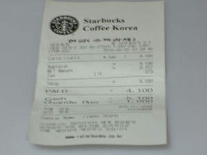| 人が結構居たので、店内写真は取らなかったので代わりに レシートを。ラテのトールが4100ウォン(300円強) |
