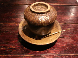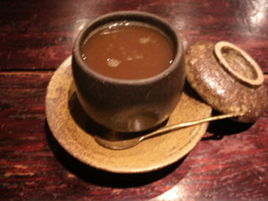 えーっと…どうやって飲むんだろう?韓国の作法からいうと、器を持つのは良くないと言うし、って言うか、持てないほど熱い。丁度、スプーンもある。これは啜って飲むのかな?と啜って飲んでたら、「これは持って飲むものです」と注意される。ふーん…そういうものか。確かに、器には持ち易いような凹みがあるわな。でも、器ごと煎じたのか、かなり熱過ぎて持てないので、最初は、ハンカチで持って飲む。