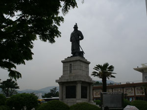 その李舜臣像を正面から。ネルソンや東郷平八郎の像も ある事だし、別にいいんじゃね?としか言いようが無い |