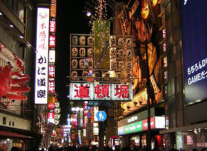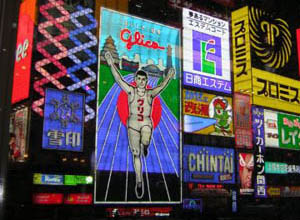 | 夜の道頓堀。巨大なカニの姿も | 同じく道頓堀は戎橋の、有名なグリコ看板 |