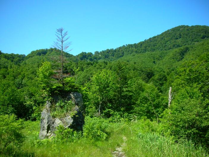 だと道が分岐しているように見えますが、実際は一本道です。岩の分岐から1時間ほど歩くと