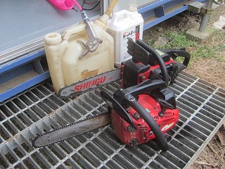 | 忘れていた。ミカンの出荷終盤になるとミカンの剪定や老木の伐採が始まる。実は「はるみ」の撰果前に、1年振りにチェンソーを取出してきた。コンプレッサでエアフィルタのゴミを飛ばし、混合油とチェーン油を注ぎエンジンの始動確認。2つあるチェンソーの内、小型の方がスロー調整が可笑しい。スロットルを戻すと止まってしまう。マイナスドライバーを調整孔へ突っ込み調整。大型はチェーン油が詰まり気味だが、まぁ使えなくな無い。そして3mm〇棒ヤスリで歯にを研ぐ。これをやらないと、ただのチェーンと化す。またチェーン油はチェーンの発熱や膨張を防ぐ重要な油だ。写真は工房前で点検を終わったチェンソー。数年前までは大きい方のハンドルを握り、片手で前方へ差し出すことが出来たが、最近は腕力が落ち小型のチェンソーがやっとだ。 これで、老木を数本伐採。カミサンは木に上り伸びた枝を詰めている。日当たりや風通し、そして作業環境を考え鋸を入れるが、剪定研修に参加しているだけあって講釈が多い。足元に散乱したミカンの木はチッパーで砕く予定だ。剪定は生産者の考えが見え隠れして面白い。狭い土地で生産量を稼ぐために、木を高くする作りを好んだ先人達の手法は、量から質と作業環境重視へと様変わりした。 |