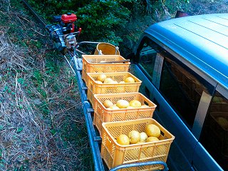 この週末はミカンに農薬散布と決め込んでいたが、天候が不安定であっさり曲目変更。多少は濡れてもOKと28日朝から西の谷津へ入りご依頼のあった甘夏(川野・サンフルーツ)の収穫。案の定途中から小雨となり早々に引き上げて帰るともう上がっている。箱詰めして発送する。基本的には曇りか小雨の一日だった。 29日は昨夜の雨露が残り陽は差すが農薬散布には不向き。それで写真の如きレモンとの闘いが始まる。 カミサンが庭先で切り取ったレモンを眺めていて急遽思いついたレモン汁絞り作戦。写真はその成果。40Kg程のレモンの皮を剥きジューサーに掛ける。凡そその半分誓いレモン汁が搾り出せた。早速OrangeVillageユーザーの皆様へ「料理や御菓子に!」と頒布案内を配信したところ早々に返信が届きビックリ。レモンは未だ少しあるので、追加の作業が始まるかも知れない。ところでレモンの香りって皮が出しているので、剥くと無くなってしまう・・・作業中のあの強烈な香りが届かないのは残念。オンマウスは29日午後、再び西の谷津へ。甘夏の枝に鳥の巣を発見。巣は空っぽだが何となく微笑ましくなる。背景に見える甘夏(川野)は直径が20cm近くもありお化けだが、もう7月と言うのに未だジューシーだ。 |