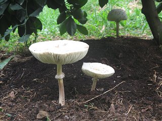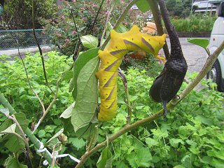 このところ雨が降って大地も湿り植物や昆虫が活気を帯びて来た。毎日何かしらの虫が目に飛び込んでくる。色もカラフルで我々の目を楽しませてくれるが、植物にとっては害虫だ。カミサンはこれ幸いとスマホで虫や植物を狙っているが、撮っているだけで何が目的か良く分からない。さて写真。工房横の三角地帯で野菜を作っているのだが、気が付くとナスの葉っぱが殆ど無い。朝は有ったのに数時間でこんな調子だ。よく見ると写真の如く黄色の幼虫。カミサンによればメンガタスズメらしいが、1匹だと良く分からないが3匹もいてあっと言う間の作業だったようだ。ナスの実は目的では無い様だが、葉が無きゃ成長しないので困ったもの。早々に捕獲して水攻めでご臨終頂いた。そしてオンマウス。汁見谷で栗拾いをしていたら栗の木の枝に居た。鮮やかな緑色で圧倒される。置物にしたい位だが相手は蛾の幼虫だが、名前は現在調べている。まさか栗の実が目的では無いと思うが、栗のイガなど全く気にしないで歩く。雨が降って気温が上がると色々な光景に遭遇する。屋敷のゆら早生ミカンの根元の草をむしっていたらこんな光景が飛び込んで来た。良くわからないが向うとこっちに2種類の真白な大型キノコ。直径10cmは下らない。 |