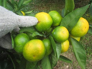 2・3日前の早朝、汁見谷の草刈りに出掛けるとカミサンに告げると、栗を拾いに行くと言って付いて来た。カミサンはせっせとオキバサミを使ってイガのままの栗を掴みコンテナへ放り込んでいた。らちが明かないので一緒に手伝うことにしたが、今年は例年より生りが少ない感じだった。それでもコンテナ一杯になり自宅へ持ち帰った。そして今日、再び汁見谷を訪れ、法面で仕上げの草刈りを始めるとその後落ち弾けた栗が地面に目立った。その場で実を取り出したり拾ったりしたら両手では持ちきれない量になった。オンマウスはその時のスナップ。栗はほぼ落ちてから拾うが、落ちる前から虫が居る実も有ある。水に沈めただけでは判別できずに苦慮する。木を大きくしないで、農薬が良く回る様にして害虫駆除管理しないとダメかもしれない。ミカンと同じじゃん。 ところで写真、汁見谷に数本ある極早生(日南種)が色付き出した。日焼け気味の実をもぎ取って食べてみると結構イケてる。日南種は余り長く生らせると味が変わる、そろそろ収穫しても良いかもしれない。この種は余りないので関係筋へ「初ミカン」として配って終わってしまう。これが終ると来月からいよいよ「ゆら早生」の収穫と出荷が始まる。 |