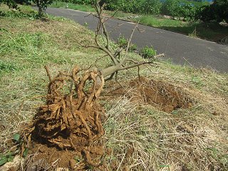 再び田んぼの草刈りが始まった。各園地の草刈りを一回りした頃には、最初に刈った処は再び刈りたくなる。気温があって雨が降るとその勢いはスゴイ。田んぼも伸びたところでは腰高くらいあり、ツル系のヤブカラシや外来を含めたツユクサ、そして堆肥に混ざていたと思われる牧草を中心に再び草の海だ。当初は実の重さで、倒壊したはるみを起そうと思って赴いたのだが、草刈りが始まってしまった。はるみは親父の時代からのもので、ゴマダラカミキリにやられ根元が腐っていたもの。首の皮だけで繋がっていた様なもので、実の成長による重みに耐えられなかった様だ。ところが、起そうと思っても100kg近い実を付けているので根元への負担が大きく、作業中に千切れてしまった(オンマウス)。さて草刈りはミカンの木の状態を診る貴重な時間。農薬散布では目の届かなかった部分が見える。ゴマダラカミキリが侵入し切粉を排出している木が2・3本あった。切開して幼虫が侵入している孔へ殺虫剤を流し込みバッチレートを塗布する。これ最後のゴマダラカミキリ対策で、放置すると根方向へ進み、成虫になって来年か再来年に穴を開けながら根元に出て来る。写真は処置した青島の若木。本当は、こうなる前に気付いて潰しておきたかった…。 |