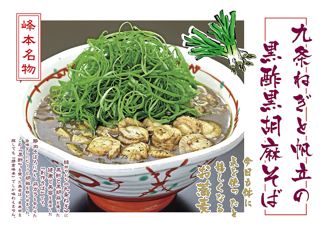 | 九条ねぎと帆立の 黒酢黒胡麻そば |
