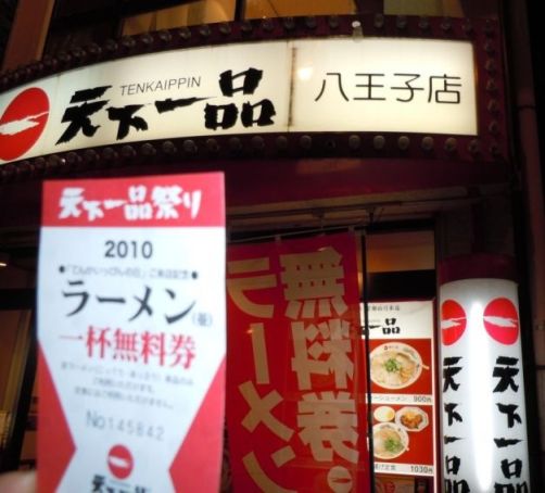 訪れた日がちょうど天一の日だったため、無料券をゲットしました。八王子店に行くまでの間、他のラーメン店が色々立ち並んでいて誘惑がけっこうあるので、行くときは天一に行く心を明確に持ってから行ったほうがいいと思います。 |