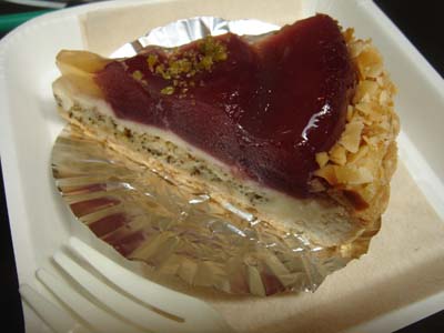 | 「豆腐チーズケーキ」(420円)。豆腐で作られたヘルシーなケーキ。ポイントはブルーベリージャムと隠し味の白味噌です。 | 「アップルパイ・ルージュ」(546円)。 サクサクとした食感のパイ 生地にアールグレーのスポ ンジと、赤ワインで煮込ん だ甘酸っぱい紅玉をたっぷ りと敷き詰めた、 大人テイストのアップルパイ。 |