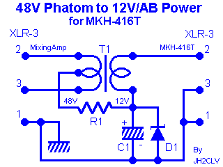 ミキサーが供給するファンタム電源のパワーは、メーカーによって異なるので、ここでは一例として記している。また48Vファンタム電源は、チャンネル毎、複数チャンネルのグループ、全チャンネルなど、供給方法もミキサーやメーカーよって様々だ。 今回はやや急場しのぎ的な感が強いので、極力簡単で手持ち部品で対応できる回路とした。左図がそれで、入出力にXLR3タイプのコネクタをオスメスで配し、間に1:1のマイクトランスを挿入。ミキサー側のトランス1次側CT(センタータップ)よりR1を経由し、C1(ケミコン)とD1(12Vツェナーダイオード)で12Vを生成する。この1Vをトランス2次側のコールド側に供給し、ホット側を出力させる。 AB方式のファンタムは、マイク電源と音声が重畳され、かつコールド側は接地される不平衡回路である。したがってこの装置の挿入場所は、なるべくMKH-416Tの近くが好ましく、ミキサ側の近くへの挿入はノイズを拾い易い。 |