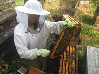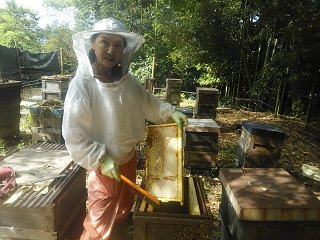 夏の百花蜜搾りの準備で、平石の蜂場で巣箱を点検に行ったカミサンが慌てて帰って来た。暫く点検をしていなかったのが災いしたのか、巣箱内に無駄巣が多量に出来、点検どころでは無かったらしい。それで急遽蜜を絞ることになり準備を始めた。遠心分離機を炎天下に取り出し洗浄して乾燥。電源のバッテリは揚水ポンプで田んぼへ持ち出しているので代替を投入。電気ポットに電源を入れ、蜜蓋ナイフを温める。作業場の室温は35℃以上もあり、やってられないので大型扇風機を準備。その間にカミさんは再び平石へ赴き、無駄巣を切り落とした巣枠を5枚持ち帰った。無駄巣削除の後が生々しく、気温が高いこともあって巣枠はハチミツまみれだ。それでも蜜蓋はしっかりと掛かっている。これをせっせと切り落とし、順次巣枠5枚を遠心分離機へ装填する。本来は9枚でバランスがとれる仕掛けだが、5枚だと分散しても均等になり難く震度が激しい。遠心分離機を手で押えながらの作業になった。 写真は夏の百花蜜の初搾り。気温が高いため流れがサラっとしている。カラスザンショウが少し混じり辛味があって美味い。オンマウスは日中の気温で37.5℃を超えている。暑い訳だ。 |