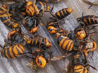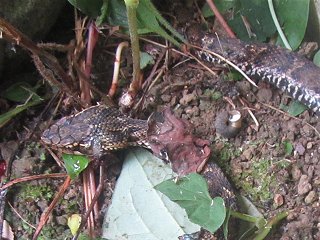 昨日26日、汁見谷のゆら早生の様子を見に行ったら、いきなり草刈りモード。破れ傘状態のハウスは、路地と変わらない草の海。1時間半程で刈り上げるが、外の青島も気になり一部を刈り出す。ところが空調ベストを忘れ暑さに耐えかね、燃料切れに合わせ帰宅し涼む。35℃超じゃやってられない。今日27日はその続きを考えたが、背戸が気になり草刈りを始めた。背戸は柿木・ヤマモモ・ツツジの他に、ハラン・センリョウ・マンリョウ・ナンテン等々が植わり、その下草にシダ類やドクダミが密集している。年に数回刈り込むが、気が向いた時やるので、前回刈った時期など忘れている。大した時間は掛からないが今回は想定外の出来事があった。涼んていたマムシに草刈り刃が接触してしまったのだ。アオダイショウやヤマカガシ等は生活の一部として頭にあるが、マムシが民家の基礎コンクリにへばり付いているなんて想定外。そもそも、音を聞いて逃げないのも可笑しい。草の様に刈られるのを待っていたのか…そんなこたぁ無いよな。回りは35℃超の猛暑だけど、ここは居眠りを誘う極楽だったのか…。写真は、分かり難いが枯葉やドクダミの中でご臨終のマムシ。このままでは後味が悪いので、穴を掘り石を置き葬った。そう言えば最近、他の小動物との遭遇も多い。猛暑で動物たちの行動範囲に変化が及んでいるのか…。オンマウスは28日二本松蜂場で捕殺したスズメバチ。短時間で30匹も…。 |