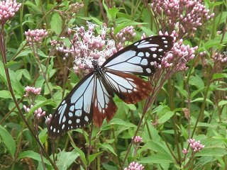 カミサンが自宅玄関前のフジバカマにアサギマダラがやって来たと言いながら、雑木を伐採していた屋敷南にやってきた。それを聞いて、昨年来移植を行い玄関前の数倍の面積に広がった柿木広場のフジバカマを見る。すると、そこにも1羽飛んでいるのを確認。そこでにわかにアサギマダラ談義になる。カミサンが屋敷の蜂場(囲い)から一株ずつ移植し、渇水期には80mもホースを張り水やりしたフジバカマが、随分と立派になった。正直ここまで広がるとは思っていなかった。家の玄関前の群生より何倍も広く広がっている。今年の飛来が本格化するのが楽しみだ。写真は玄関前のフジバカマに現れたアサギマダラ。初日だからなのか、フジバカマの花に着地するまでずっと飛び続け、中々シャッターチャンスを与えてくれなかった。やはり最初の地で警戒しているのだろうか。オンマウスは柿の木広場のフジバカマ。遠方に自宅と無線鉄塔が見える。柿木広場は通称農免道路から俯瞰で出来るので、もしアサギマダラが飛来すれば上空から観察することが出来る。