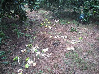舞台と屋敷南の獣害に気をとられていたら、何と10月13日の昼、屋敷のゆら早生でイノシシの喰痕を発見。家の敷地から10m程度しか離れていない。そして同日夜、自治会の会議に出席し20時頃巡回に行くと、舞台と屋敷南の早生で多量の食痕を発見。日没後の18時の巡回では異常は無かったのに。週末から雨模様でイノシシの活動が活発化しているのか…。これはだたごとでは無いと、今まで控えていた電柵の設置を決意。蜂場で使った残材を集め、午前中に屋敷ゆら早生、午後舞台と屋敷南の早生に電柵を設置した。屋敷は蜂場から延長し、侵入されそうな方面を囲み自宅側はオープン。舞台と屋敷南の早生は道路法面のコンクリ壁を利用し、園地を延々と100m以上張って囲んだ。こちらは土地の起伏が多く、草もあり作業には時間を要した。結局終わったのは17時を回り辺りは薄暗くなっていた。舞台南側に市道を挟んで極早生園地がある。園主殿が作業をしていたので獣害の話を持ち掛けると、同様に昨夜被害に遭ったとこぼされ、明日天候が回復したら急遽収穫する!と続けた。電柵を張ってイノシシを追いやってもイノシシの数は減らない。獣害の場所が変わるだけだ。この悪循環を断ち切る方法はないモノか…。ミカンが色付くとハクビシンやアライグマ等の動きも活発化する。ウーン頭が痛い…。写真は舞台早生の喰痕。オンマウスは斜面に張った電柵。