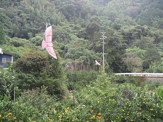 舞台と屋敷南の早生に電柵を設置してから、イノシシの被害は今のところ無くなった。動体検知のストロボや超音波による対策は、設置当初は効果が期待できるが、その後は獣たちに学習されてしまい全く効果が無くなった。電柵は口や鼻が触れれば感電し、ビックリして近寄らなくなる。見事だと思う。それで、昨年は酷い鳥獣害に遭った寺山の寿太郎畑へ早目に電柵を設置した。オンマウスがそれ。面積は1アールも無い場所で、500kg程の収量が見込めるが、昨年は半分程度しか無かった。未だ果は真っ青だが、色が着く前に鷹カイトも設置する予定でいる。写真は屋敷ゆら畑と舞台早生畑に設置した鷹カイト。ゆら早生は来月初旬の出荷用に未だ500kg近く残っていて、舞台早生は着色が始まり来月下旬に収穫予定。何れも地上の獣は電柵で対策出来るが、着色は鳥を招くので鷹カイトの出番となった。これ以外に汁見谷の早生にも鷹カイトを設置して様子を見ている。その効果は鳥の種類や、単独か群れで異なる様な気がする。数百羽の旅ガラスの群れがやって来ると、地元のカラスもおとなしくなる程で恐ろしい。ヒヨドリやメジロも集団でやって来ると人が近付いても逃げず、平気でミカンを突いている。年ごとに学習が進んでいる様にも見える。本当に困ったものだ。