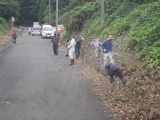 尾羽畑総恒例の秋の草刈りが4日8時より行われた。地区ごとに指定された道路の法面や歩道の草刈りを実施。既に役員による除草剤散布が行われていて、除草剤がかかった所は見事に枯れている。しかし、ツル系の葛や、除草剤の届かなかった雑草木がしつこく残っていて、作業時間は3時間に及んだ。地区ごとのレベル合わせが不十分で、作業の程度に温度差があり苦慮。当地区は主道路で長スパン担当なので、結構荒っぽい草刈りになってしまうが、小路を担当地区はやたらと丁寧で驚く。まぁ文句も言わず、それぞれのペースでやるのが一番良いのかも知れない。写真は法面の草刈り風景。