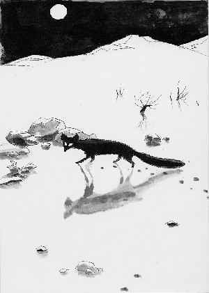 |  | 3本足の狐 「山からの絵本」3本足の狐の挿し絵 狐に鶏をおそわれると疑心暗鬼に陥った村人が仕掛けたトラバサミにかかった右前足を自分で食いちぎって逃げ、3本足の狐として伝説化した狐の物語。 |