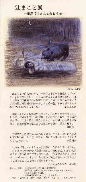 |  | 1993年10月7日から11月30日に、山梨県小淵沢の小淵の森フィリア美術館で 「高原で辻さんと会おう展」と題して、NHK甲府放送局、山梨日々新聞社の後援で開催された。 これは、このときの案内はがきです。 使われている絵は「毛だらけの関取」と題されているものです。 現在、文庫版「山の声」のカバーに使われています。 |