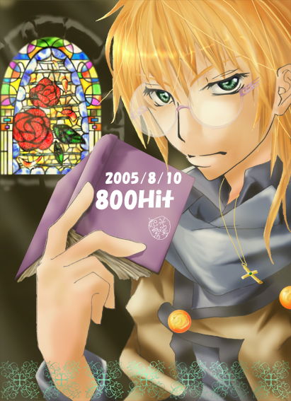 「読書をしているメガネのお兄さん」ステンドグラス(誰が何と言おうと)以外に手間かかって大変でした。資料全然見つからなくて困りました。…読書してるんでしょうか?ただ持ってるだけですね(汗)お目目が無駄にキラキラなのが気色悪い(笑)それでは800番踏んで下さってありがとうございましたv