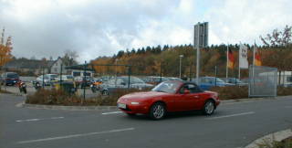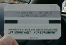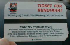 待ちに待ったこの日がやってきた。 この日はモーニングコールより早く目が覚めていた。(らしい・・・私は眠ってた・・・) 起こされた私は、「こんなに薄暗い中走るの?危ないよ・・・」。 まだあたりは真っ暗。 しかし時刻は7:00を回っている。。。 身支度を整えて朝ご飯を食べに行くと、用意はされているものの食堂は非常に静かである。 食事を終えて8:15。 「出掛けよう」の彼の一言でコースへ。 駐車場にはどこかのメディアの車だろうか?右前にビデオカメラを取り付けている。 それにしても本当に寒い。一段と冷え込んでいる。 8:30からコースインできるのに、チケットセンターにいる人たちは非常にのんびりである。 時間が違うのか?今日は寒くて霜が降り、コースが危ないから走行時間をずらしているのでは? 勝手な想像をし車の中で待機する。 既に時刻は9:00を回っている・・・ おかしいなぁ・・・と思ってもドイツ語が分からないからひたすら待つのみ。 チケットは自動販売機で買うことができるからと説明を受けたので12周分の 回数券(190DM)を買おうとした。 ・・・・・・1DM(ドイツマルク)=約60円なので190DMは約11,400円。 が、100DMの紙幣は受け付けないらしい。 |