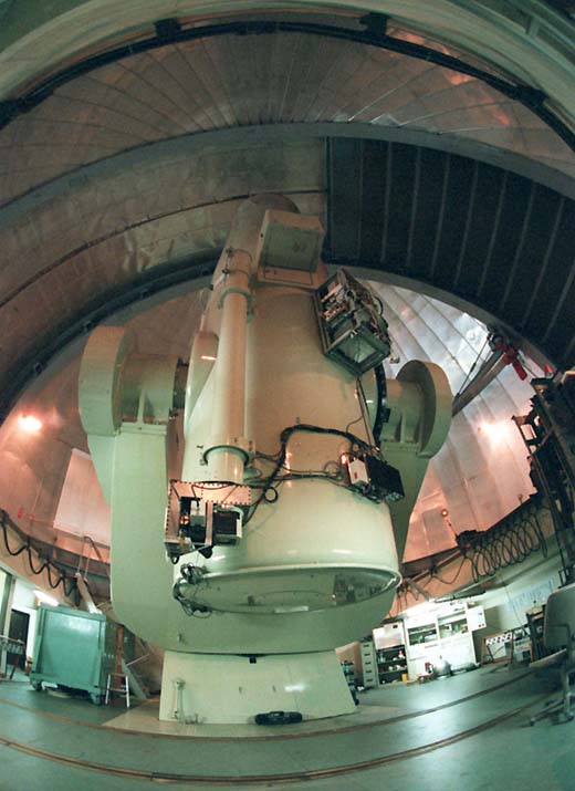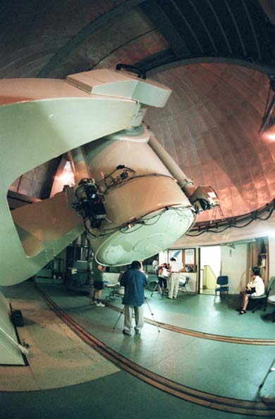 三脚を立てて熱心に撮影をしている人がいました。 2本のレールが見えます。左奥から台車がレールの上を、ちょうど望遠鏡のオシリの真下に来るようになっていて、1.5mの反射鏡を定期的に清掃する時の取り外しのための設備です。 また、反射鏡の再メッキのときは工場へ運ばなければなりません。 |