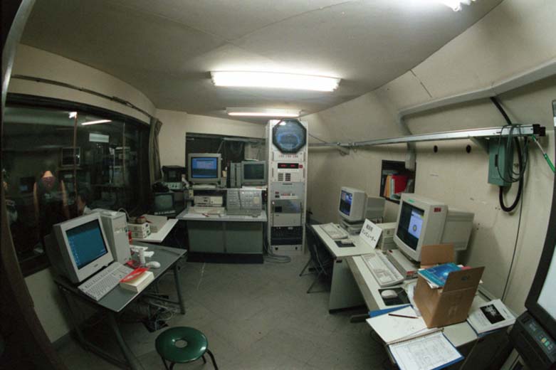 制御観測室。正面の機械が望遠鏡をのコントロールするコンピュータ。三菱電機製。左のパソコンはインターネットにつながっていました。天気が思わしくなかったのでちょいと拝借、http://www.tenki.or.jp/で雲のようすを確認しましたが・・・。右側のコンピュータは撮影した天体画像の処理用。