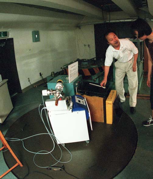 中田先生が写真乾板のマガジンの説明をしています。わかりにくいですが黒い箱がマガジンです。 手前はCCDの冷却装置です。液体窒素を使います。 床の丸い部分は1階へ抜けるようになっています。先生の後ろがちょうど上の写真のレールの奥にあたりますが、そこに反射鏡を乗せる台車があるのがみえます。台車で運ばれてきた反射鏡をこの床の部分から下に降ろして外に持ち出すんです。 |